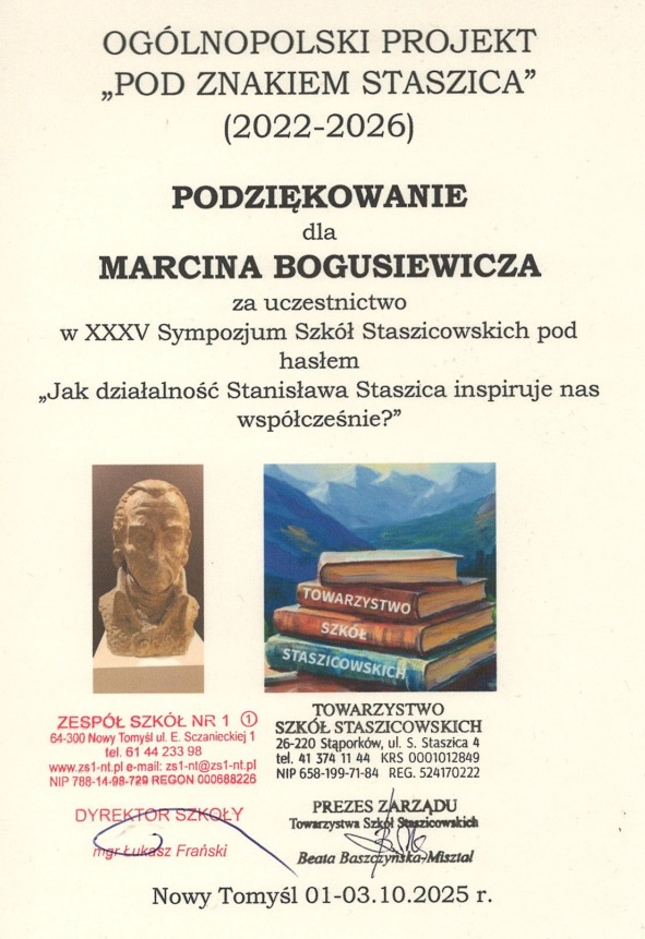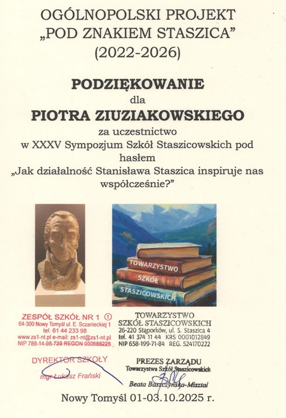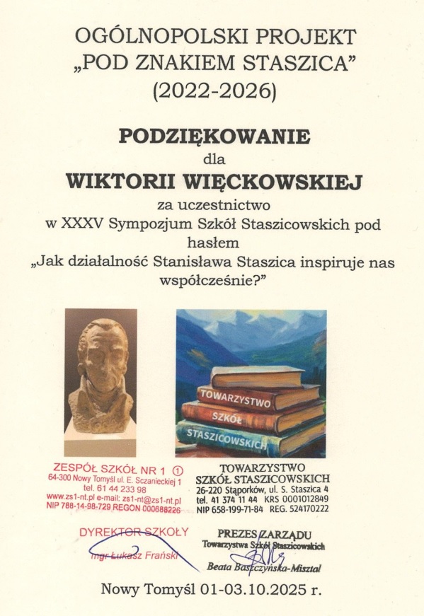 Od 1 do 3 października 2025 roku uczniowie klasy 4EH wraz z wicedyrektorem panem Piotrem Ziuziakowskim wzięli udział w XXXV Sympozjum Szkół Staszicowskich. Tegoroczne spotkanie odbyło się w Nowym Tomyślu i Pile, a jego motywem przewodnim była współczesna inspiracja postacią Stanisława Staszica. Trzy dni sympozjum upłynęły w atmosferze nauki, integracji i wymiany doświadczeń między szkołami z całej Polski.