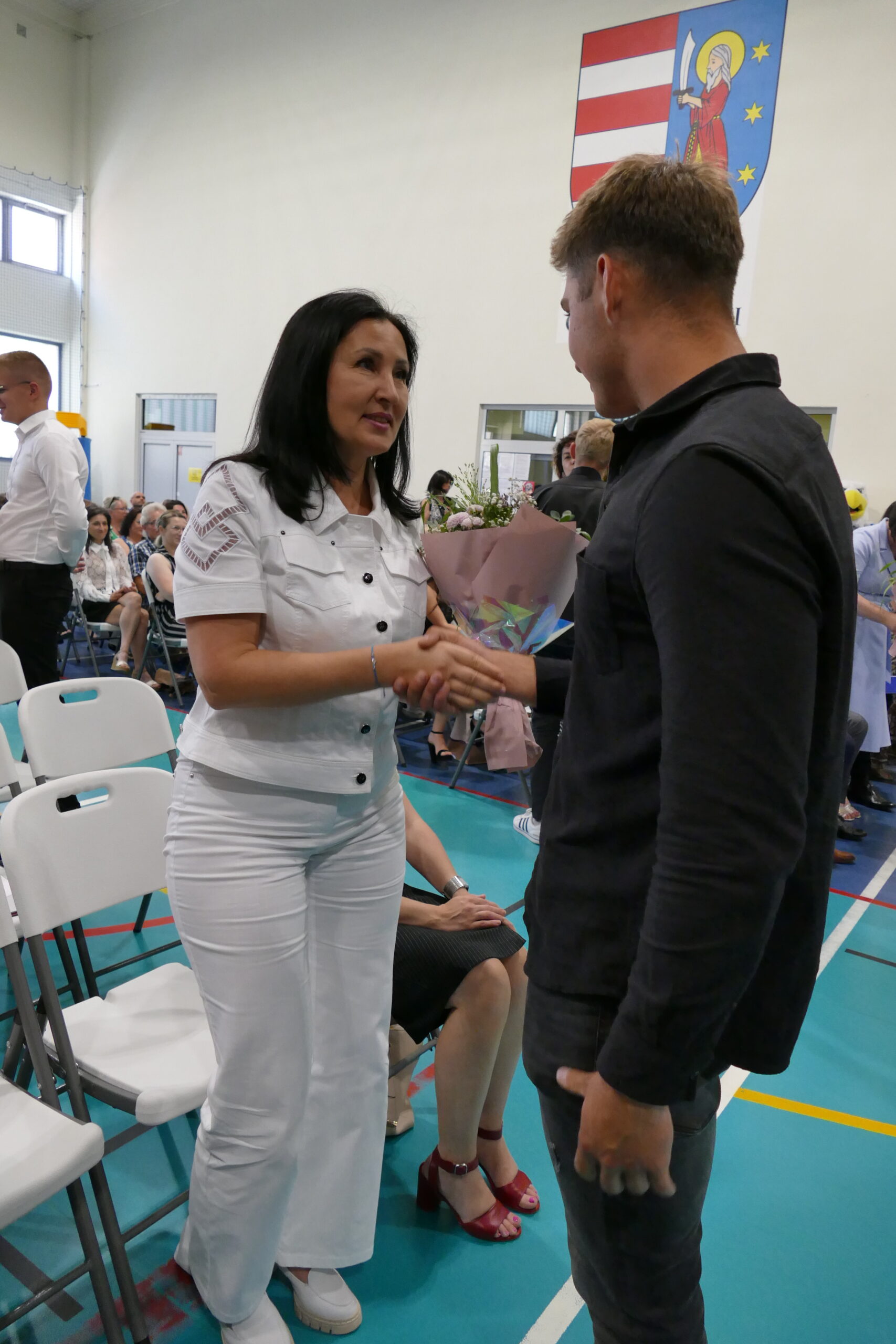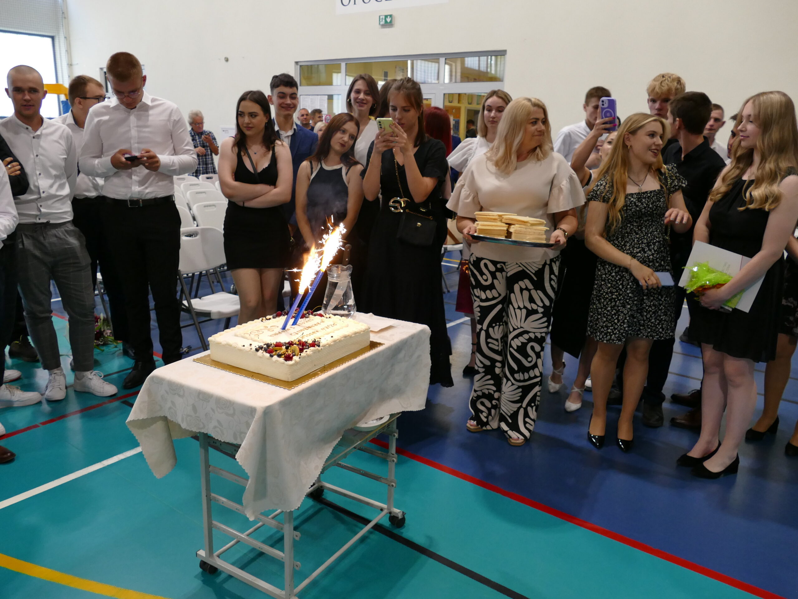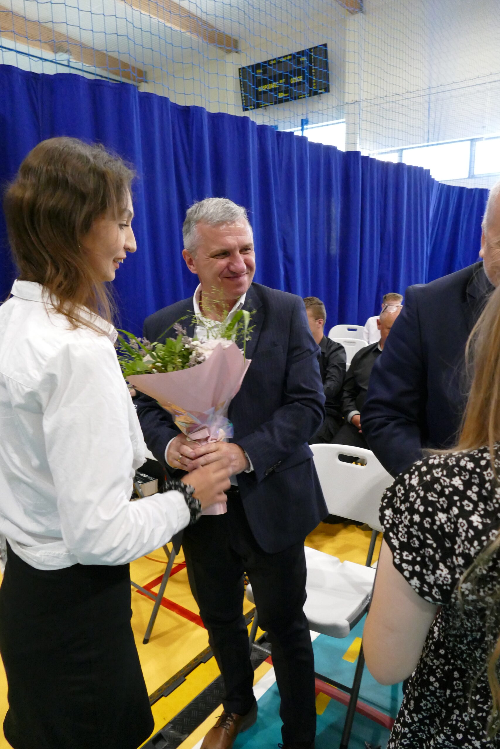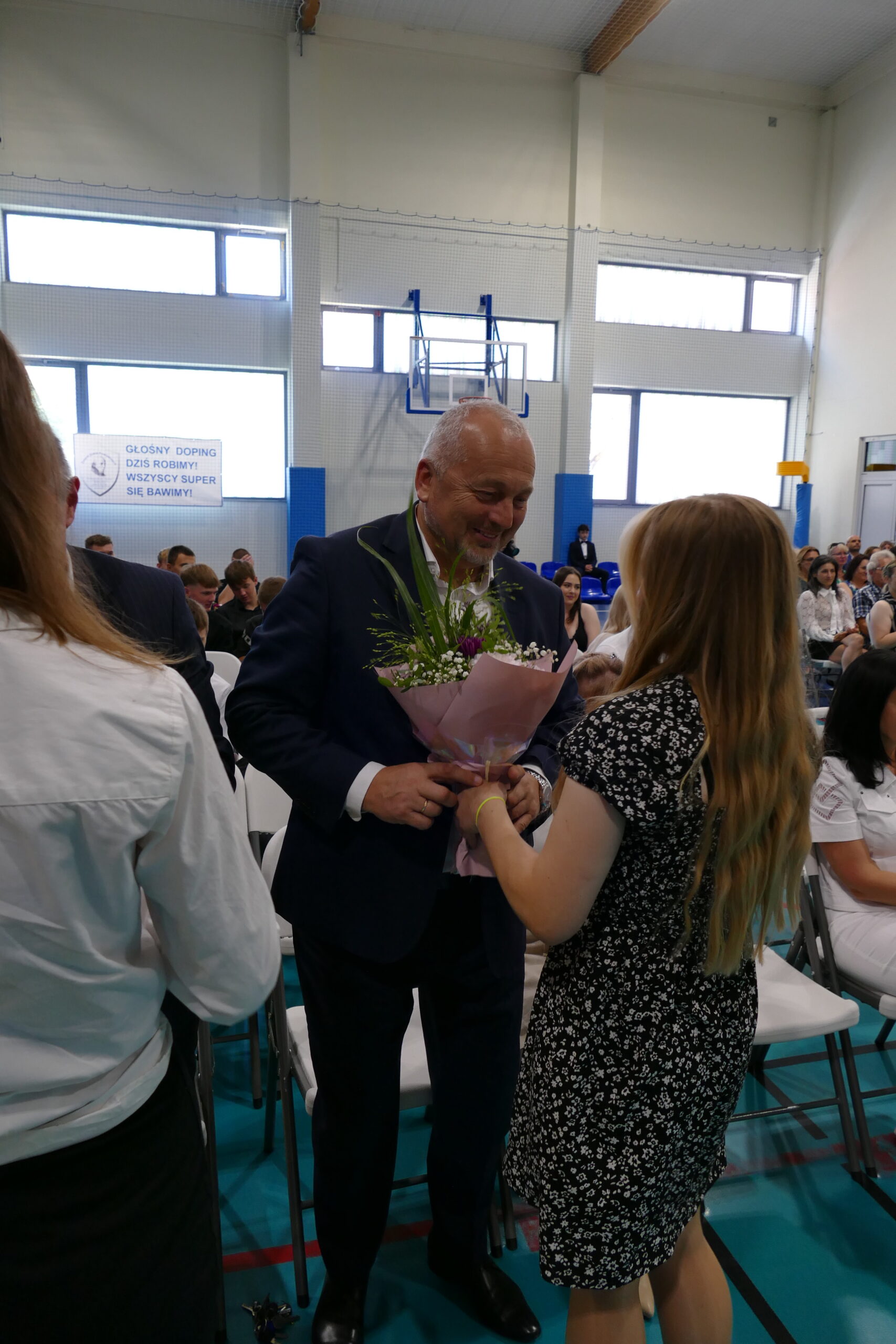 W tym szczególnym czasie pożegnania absolwenci słowa podziękowania skierowali również w stronę swoich wychowawczyń – pani Katarzyny Łukowiak i pani Tatiany Kosylak oraz nauczycieli uczących. W imieniu uczniów klas kończących głos zabrali Natalia Deka oraz Igor Piekarski. Wychowawcom zostały wręczone bukiety kwiatów a wszyscy nauczyciele otrzymali słodkie upominki.
