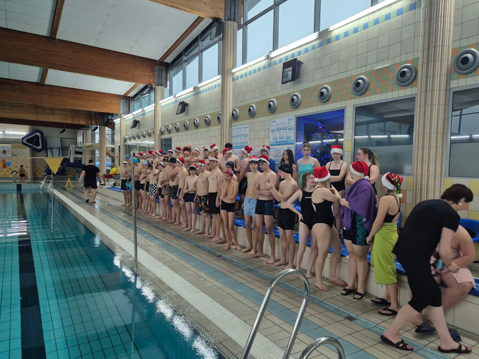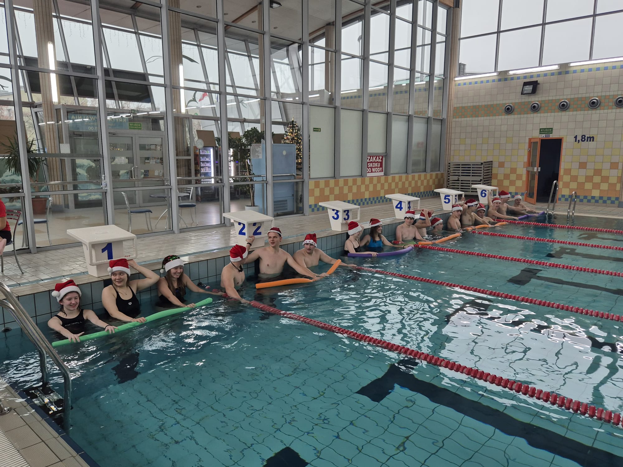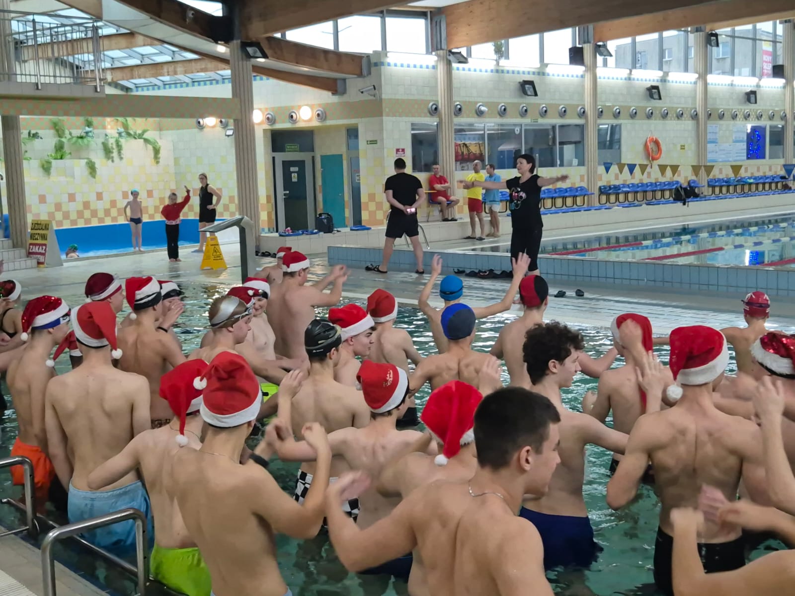 Zawody oficjalnie rozpoczął pan dyrektor Dariusz Kołodziejczyk – przebrany za Mikołaja. Na początek została przeprowadzona przez panią Dagmarę rozgrzewka wszystkich zawodników-Mikołajów na basenie rekreacyjnym, a następnie na basenie sportowym odbyło się krótkie rozpływanie przygotowujące do startu.Jak co roku miało miejsce pływanie „na wesoło”, tym razem wszyscy uczniowie w czapce mikołaja mieli za zadanie dobrać się w 3 osoby i przepłynąć dystans 50m z makaronem, ale nie można było zmoczyć czapki mikołaja – co okazało się trudnym wyzwaniem.