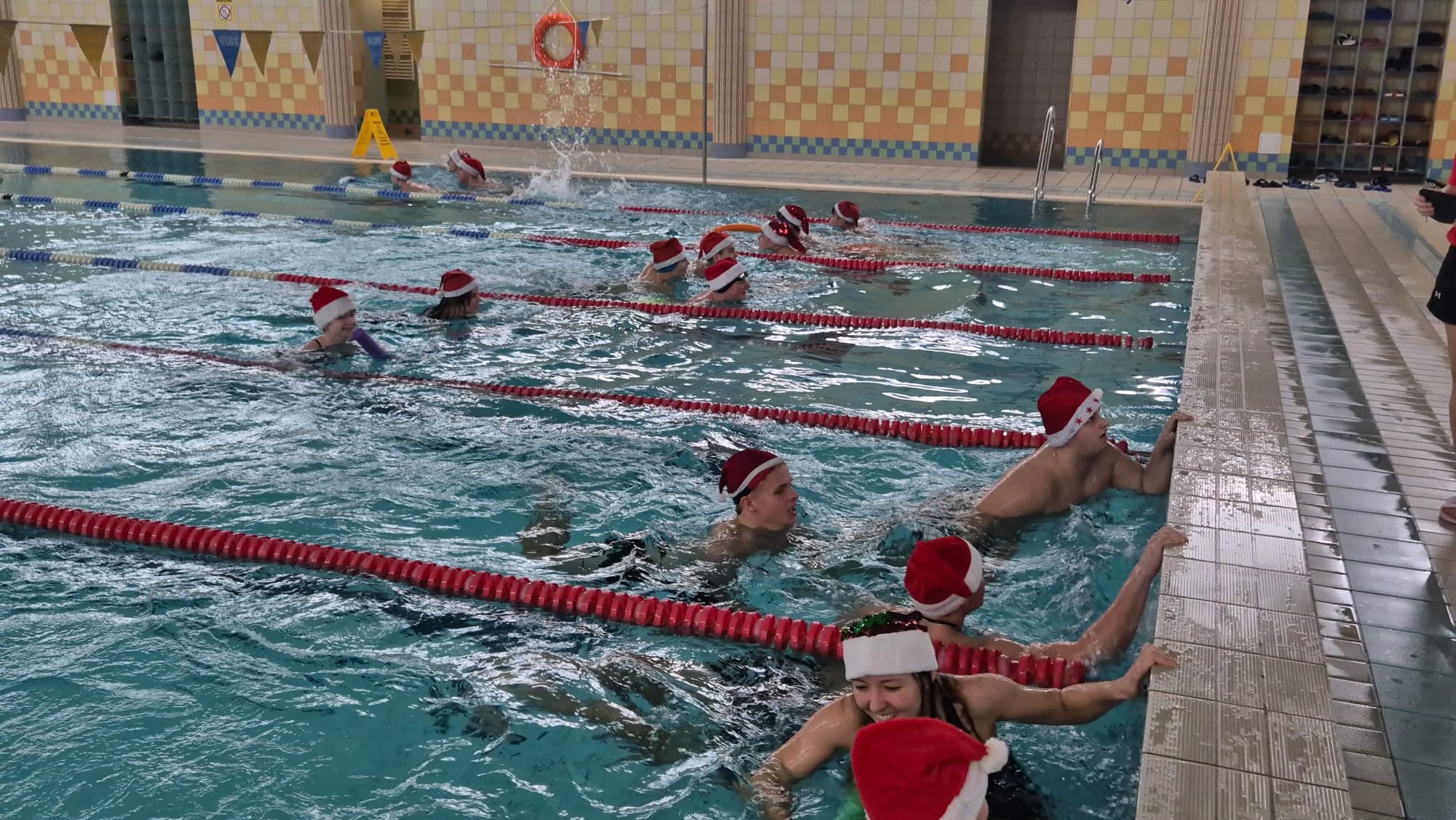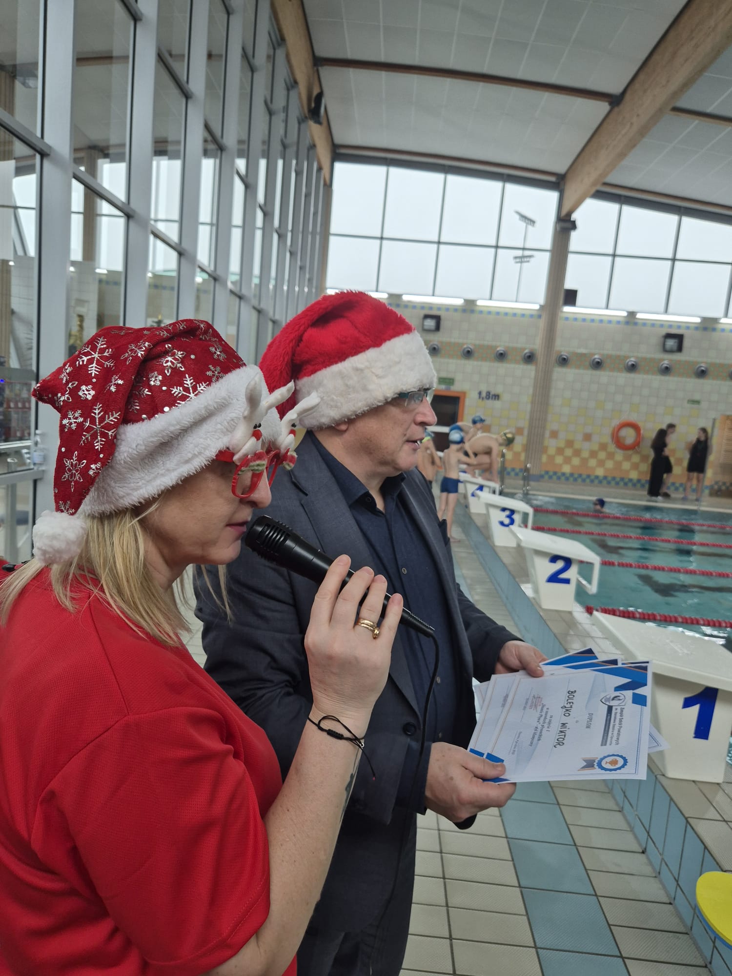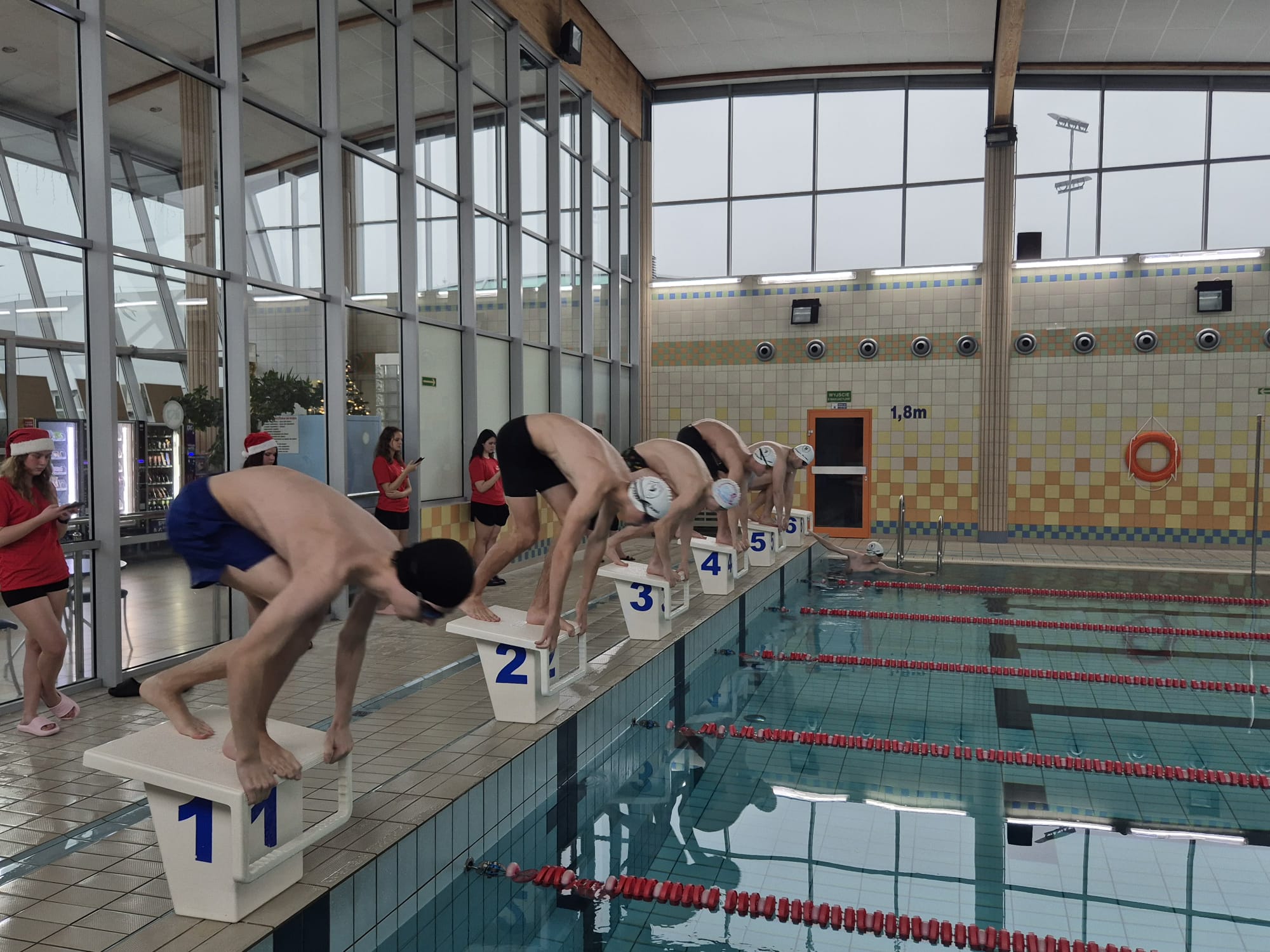Zawody oficjalnie rozpoczął pan dyrektor Dariusz Kołodziejczyk – przebrany za Mikołaja. Na początek została przeprowadzona przez panią Dagmarę rozgrzewka wszystkich zawodników-Mikołajów na basenie rekreacyjnym, a następnie na basenie sportowym odbyło się krótkie rozpływanie przygotowujące do startu.Jak co roku miało miejsce pływanie „na wesoło”, tym razem wszyscy uczniowie w czapce mikołaja mieli za zadanie dobrać się w 3 osoby i przepłynąć dystans 50m z makaronem, ale nie można było zmoczyć czapki mikołaja – co okazało się trudnym wyzwaniem.