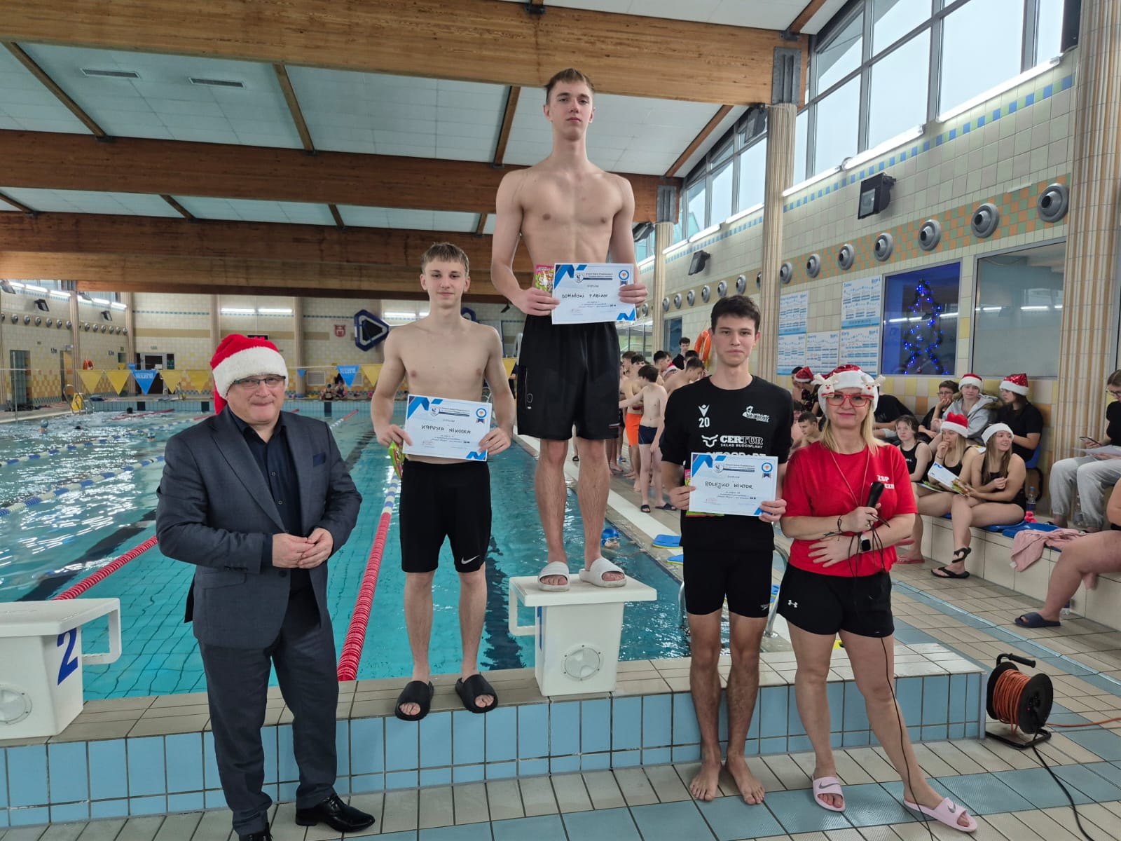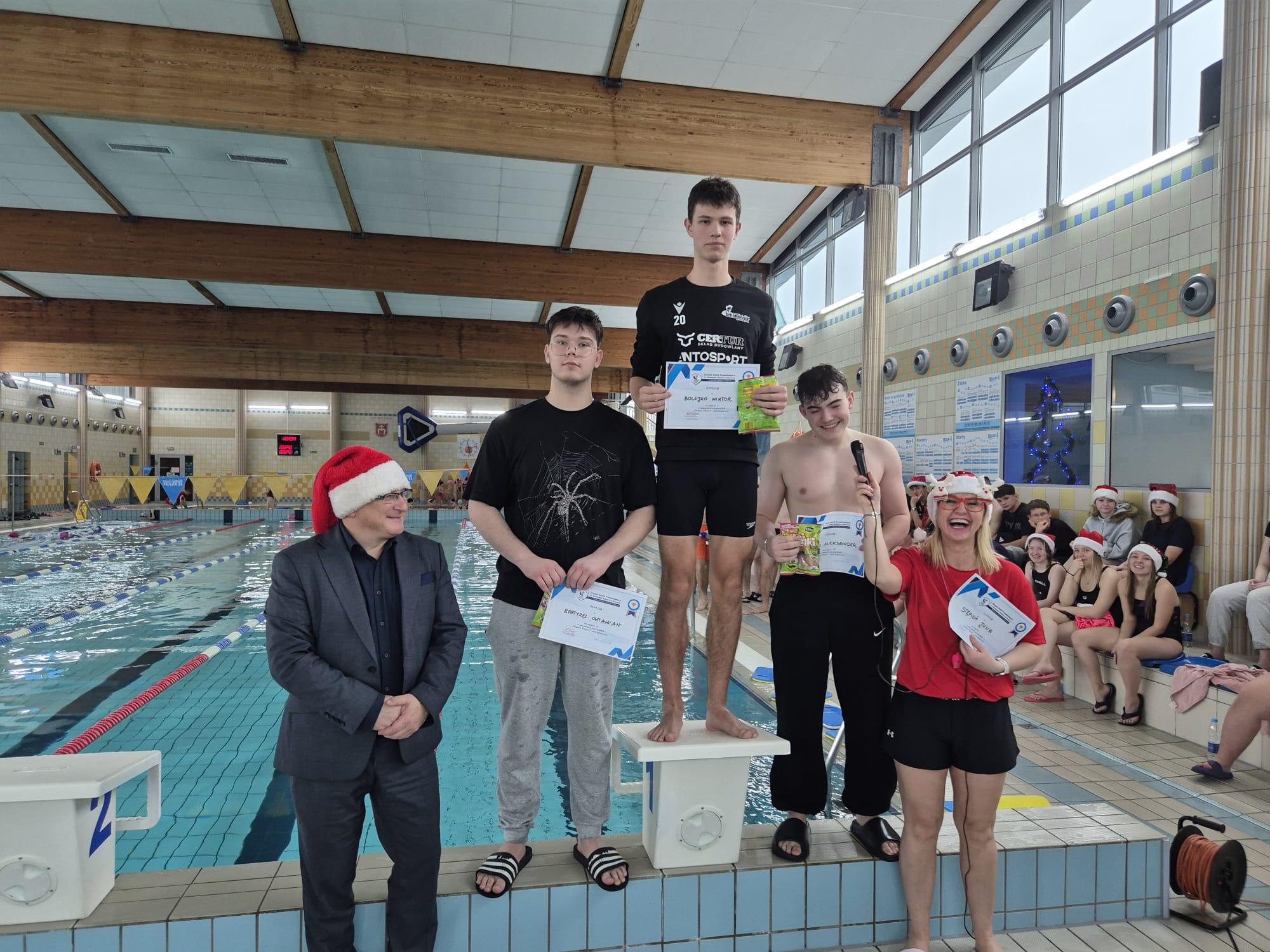 Na zakończenie zawodów ponownie przybył dyrektor szkoły Dariusz Kołodziejczyk, który jako święty Mikołaj wręczył zwycięzcom pamiątkowe dyplomy oraz słodkie upominki ufundowane przez Radę Rodziców .